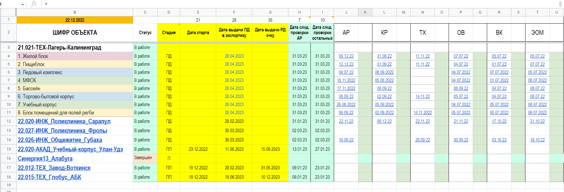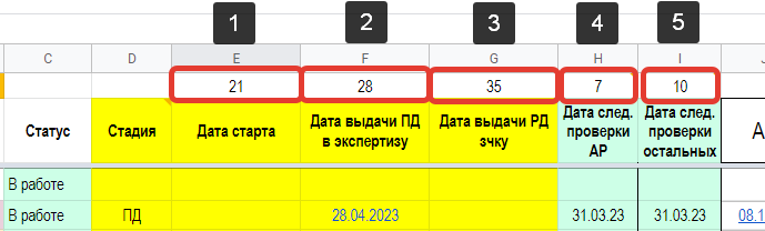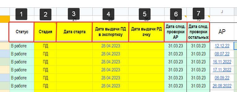 - Данные заносят вручную. Участвует при стадиях КП и ПП в столбцах «Дата следующей проверки АР» и «Дата следующий проверки остальных»;