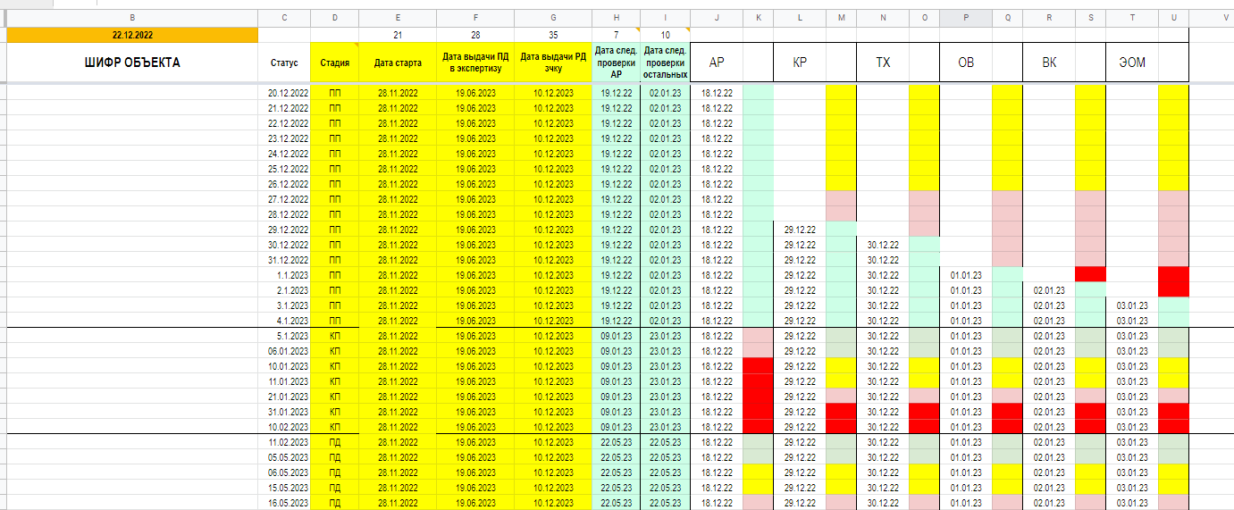 - Данные заносят вручную. Участвует при стадиях КП и ПП в столбцах «Дата следующей проверки АР» и «Дата следующий проверки остальных»;