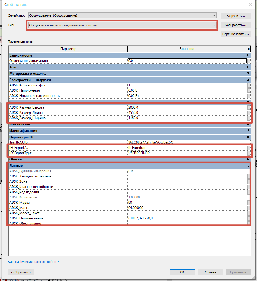 3. Для каждой позиции по спецификации создается свой тип, у которого заполняются параметры:
