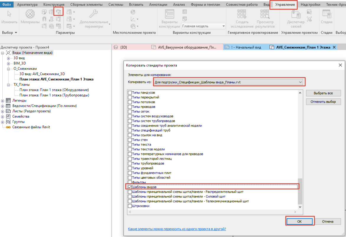 необходимо скопировать подготовленные шаблоны видов через копирование параметров проекта. Для это оба проекта должны быть открыты в одном окне