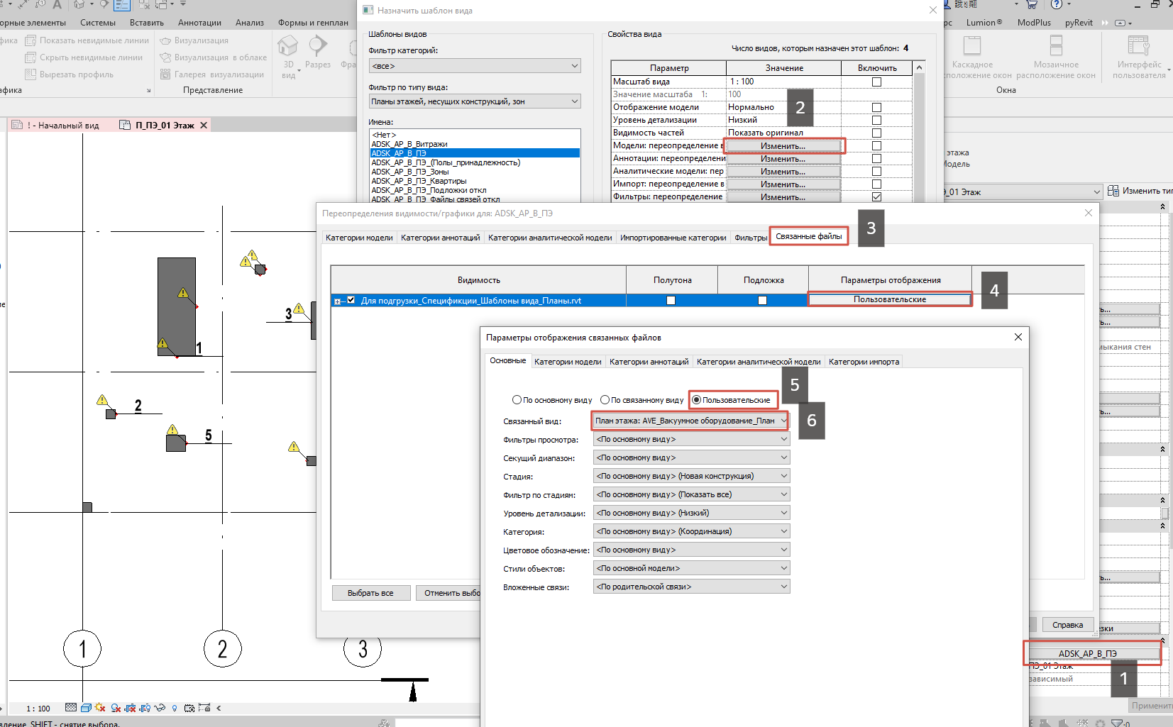 11. После подгрузки файл ТХ связью в свой проект, необходимо создать вид плана и настроить на нем отображение конкретного плана-задания ТХ через пользовательские настройки отображения связи.