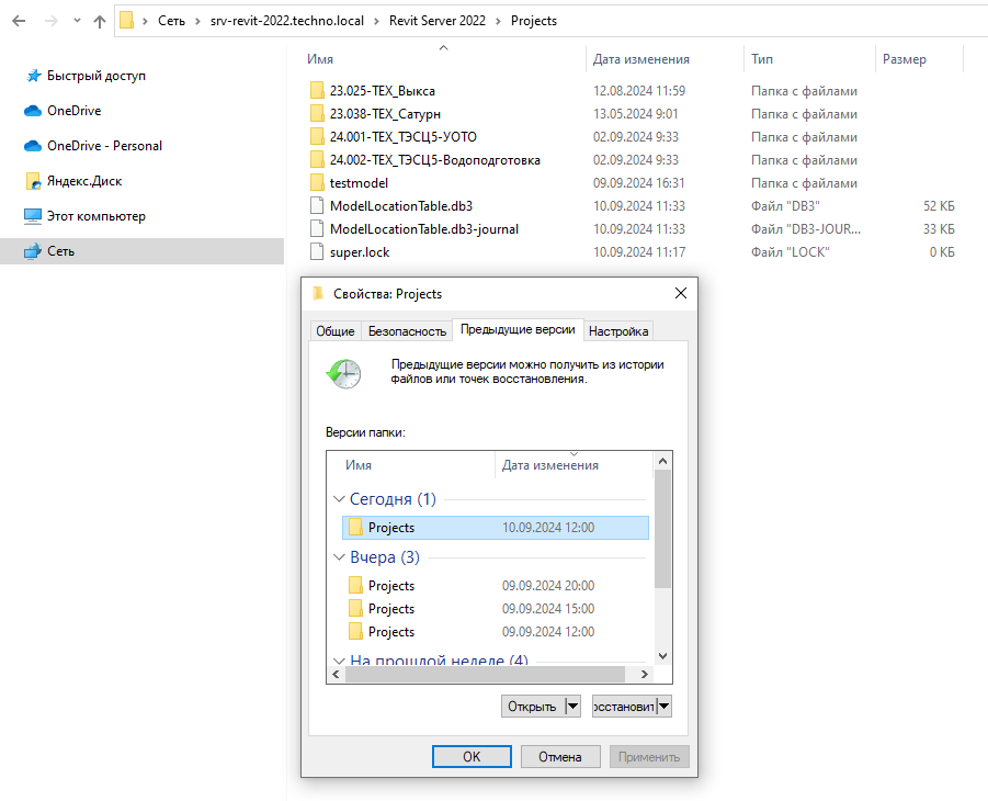 1. Все резервные копии проектов с Revit Server можно найти в папке с проектами, выбрав в свойствах папки «Предыдущие версии»: